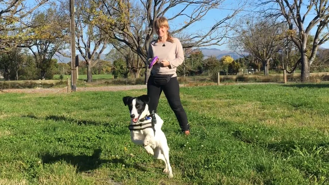 Does your pup keep slowing down? Throw the treat on the ground just ahead of you.